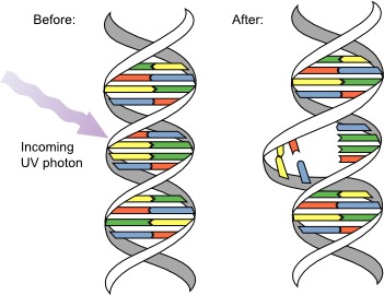 DNAs damaged by UV light as shown above produce the wrong proteins and cells.