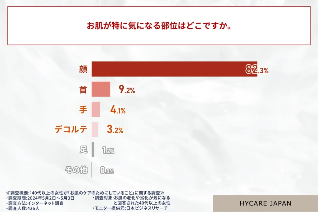 まず、「お肌が気になる部位はどこか」という設問に対する回答で最も多かったのは「顔」で回答率は82.3%を超え、次に多かった「首」とのポイント差も大きく、圧倒的に多くの方が「顔」が気になっていることがわかりました。