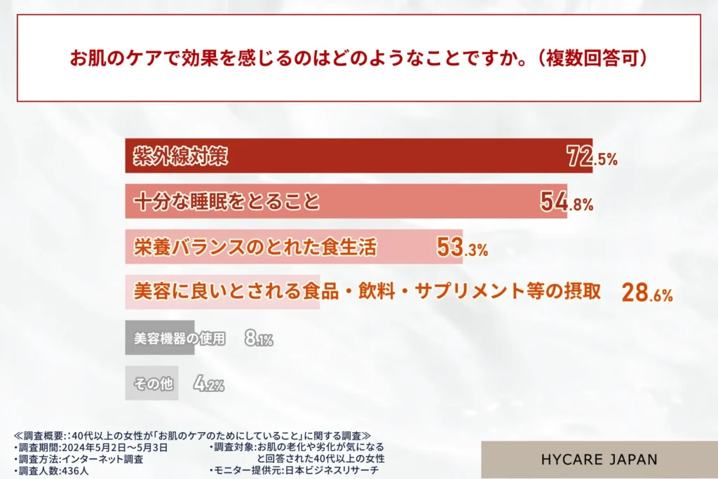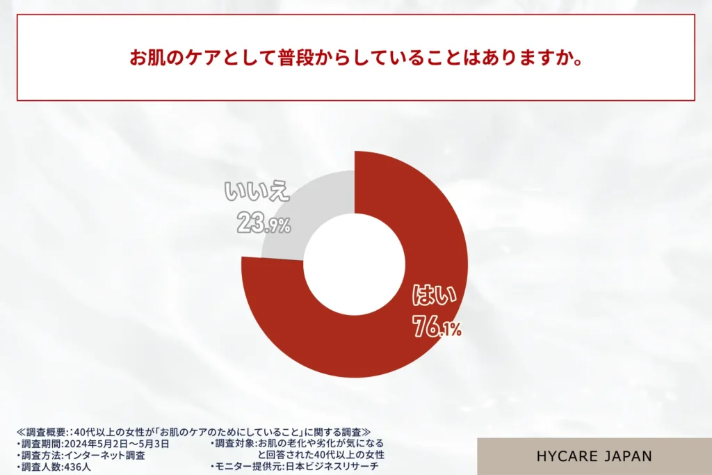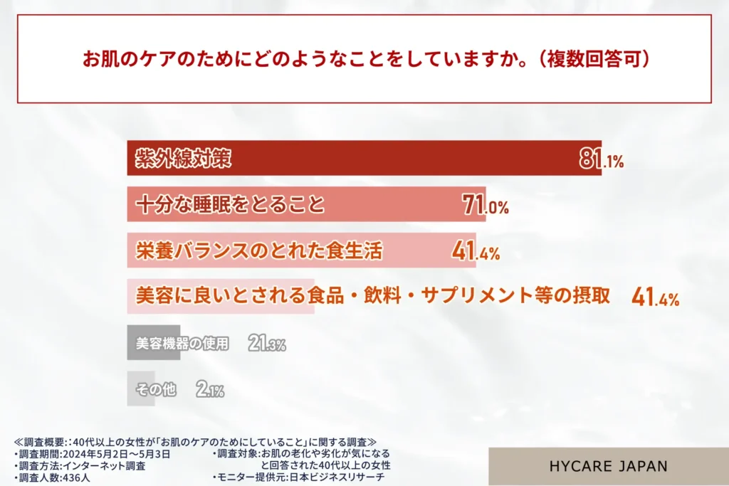 そこでハイケア高濃度水素によるスキンケア事業を展開するハイケアジャパン(株式会社ビースタイル)は40代以上の女性が「お肌のケアのためにしていること」に関する調査を行いました。